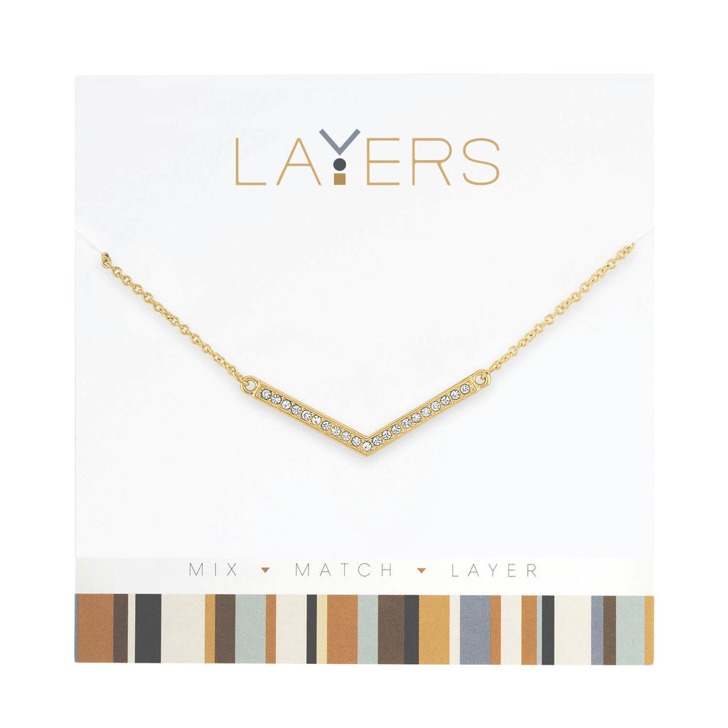Center Court Layers Necklace Gold Crystal LAY105G This petite, gold-tone necklace from Layers has a gold tone and crystal wide v shape on its adjustable, drawstring chain. Mix and match multiple necklaces to create a layered look that complements any style with a flair that's totally you! The styling possibilities are endless!