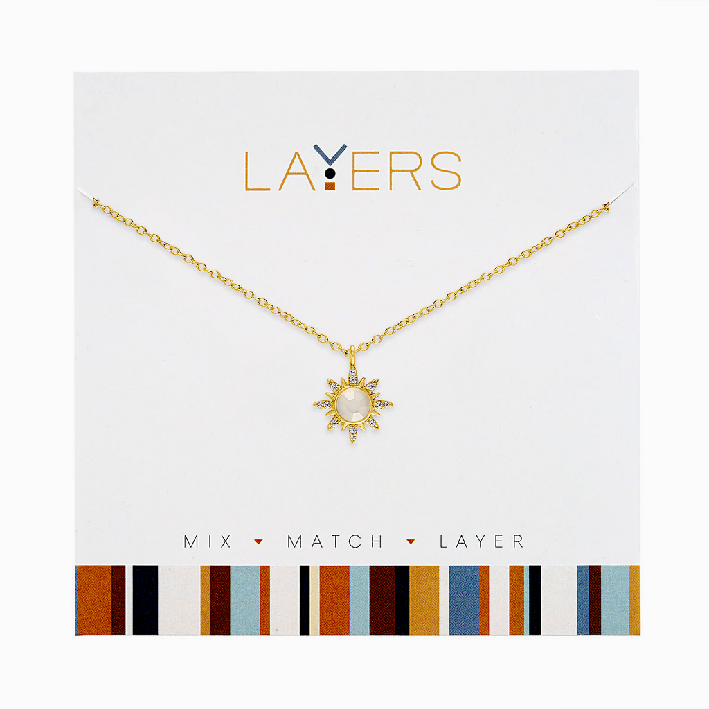 Center Court Layers Necklace Gold Sunburst Crystals Opalescent LAY135G This petite, gold-tone necklace from Layers has a sunburst with crystal rays and an opalescent center on its adjustable, drawstring chain. Mix and match multiple necklaces to create a layered look that complements any style with a flair that's totally you! The styling possibilities are endless!