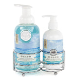 Michel Design Works Beach Hand Care Caddy brings compelling marine notes with hints of bergamot, amber, and watermelon. The silver-toned hand care caddy includes the popular foaming hand soap and rich hand and body lotion together in one convenient holder.