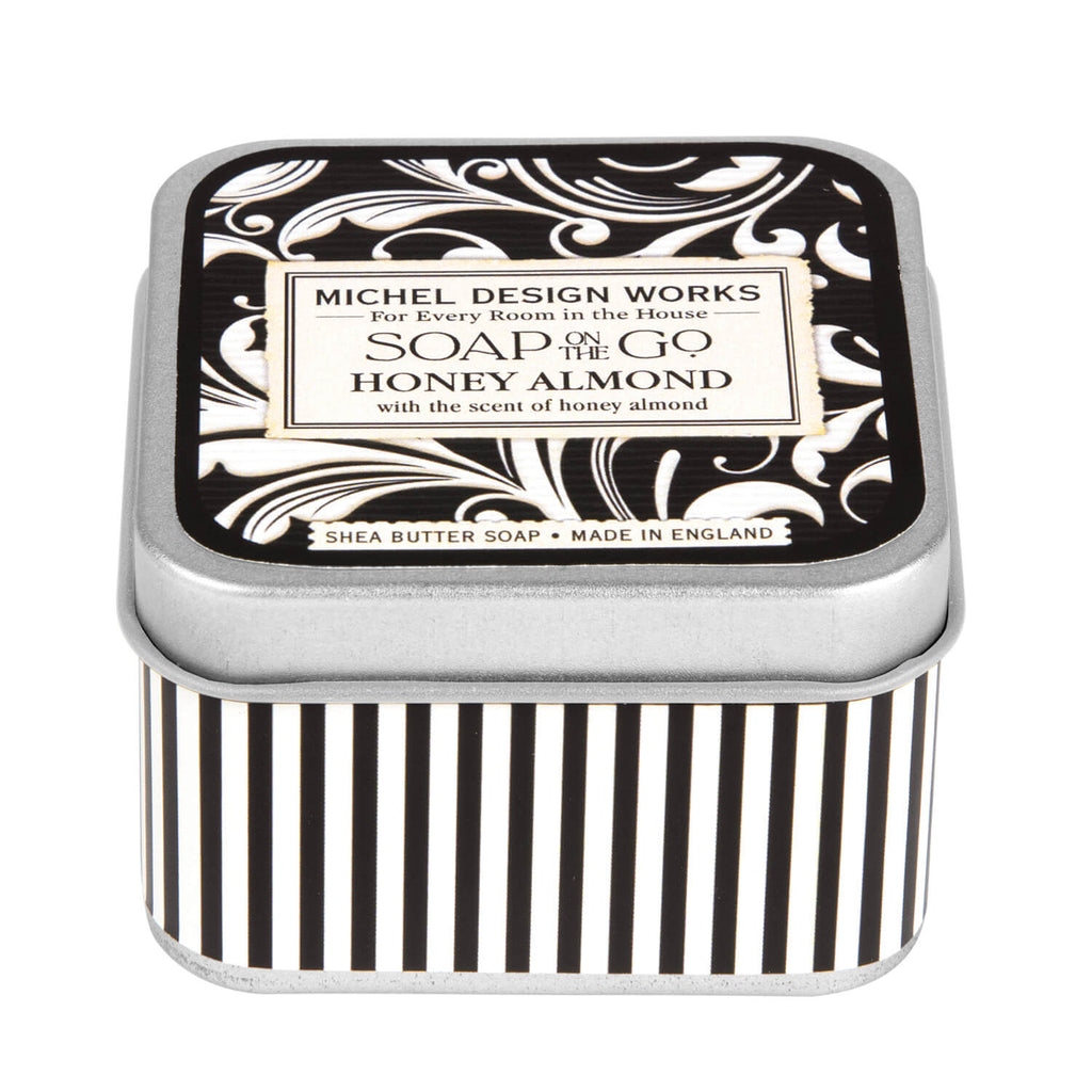 Michel Design Works Honey Almond Soap On The Go A sweet little tin filled with 8 scented mini soaps. Tuck a tin in your purse or gift to anyone as the perfect send off on a trip. Of course it’s also a thoughtful little indulgence for houseguests. Made in England. SOTG182
