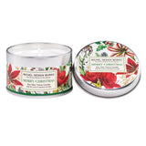 Michel Design Works Merry Christmas Travel Candle showy amaryllis with classic Christmas holly and pine highlight a lush collection of winter florals. Scent of holly and winter florals with touches of carnation, rain, bamboo, and palm leaves. This all-natural, 100% soy wax candle is nontoxic, biodegradable and clean burning. The handy, decorative, and versatile tin can be used at home or when traveling, indoors or out.
