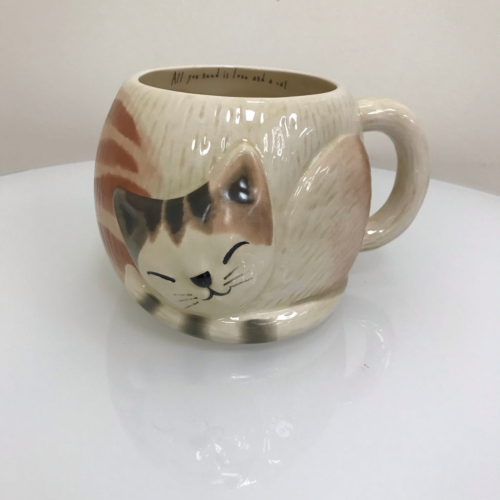 Natural Life Cat Mug features an adorable cat design mug with “all you need is love and a cat” written inside, hand sculpted, ceramic mug, microwave and dishwasher safe, food safe,